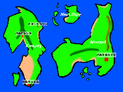 | 東側の大陸がミュスグルド、西側の大陸をクバレックといいます。 両大陸は大きな海流によってさえぎられ、海路での行き来は難しくなっています。 そのため交流は乏しいというのが現状です。 ちなみに、北にある大きな島の集まりがニュート・ベルグと呼ばれる禁忌領域で、島の周りを囲む海流と気流で、どの道からも遮断されて何者をも寄せ付けない土地となっています。 |